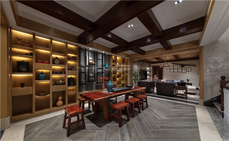 典雅大氣的中式茶室,運用面積優勢設計一整面墻的展示架,帶給人視覺上的沖擊力,一茶一室,皆是生活。