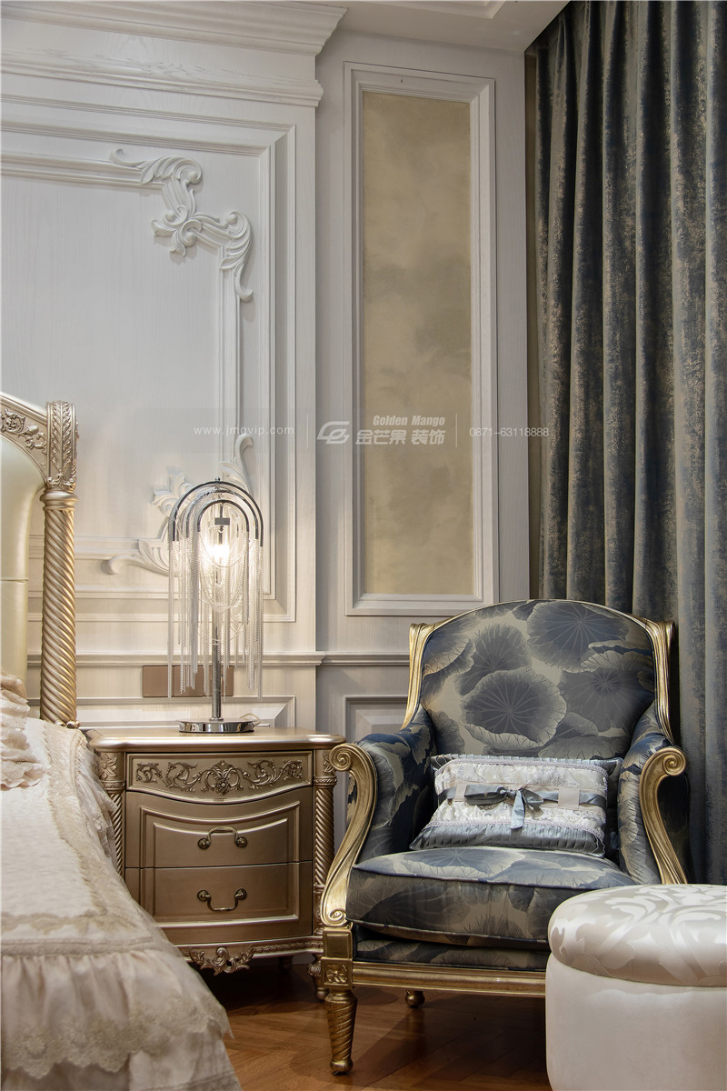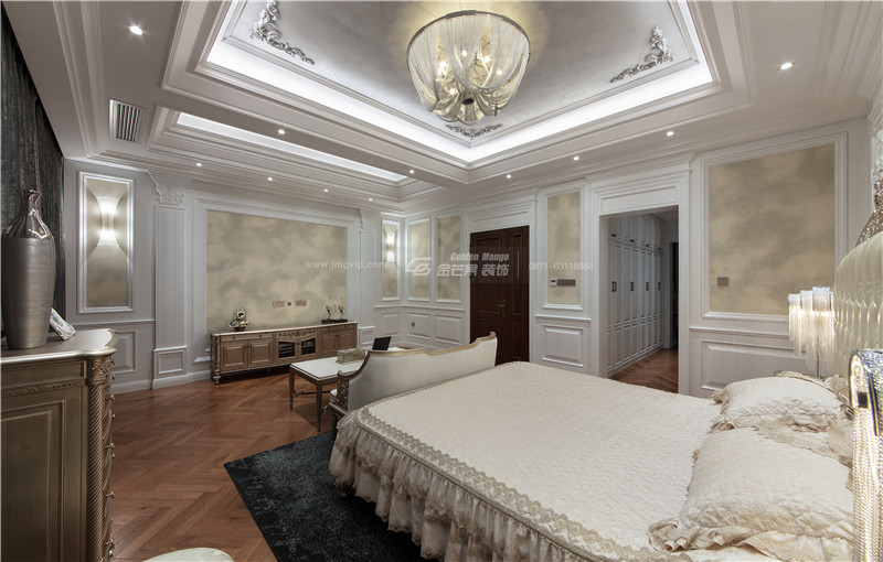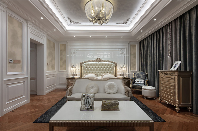寬闊的空間加上大面積的白色,浪漫、高潔的臥室歲月構想在此流動成一段唯美的樂章。如夢似幻,燈飾的流蘇設計仙氣飄飄,無論是吊頂的銀色雕花還是墻上的雕花暗紋,無一不透露出細節的搭配。