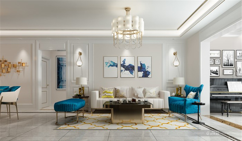 地毯運(yùn)用金色和白色元素搭配,彰顯華貴感。墻上的裝飾畫營造藝術(shù)氛圍,藍(lán)色也和空間相呼應(yīng)。