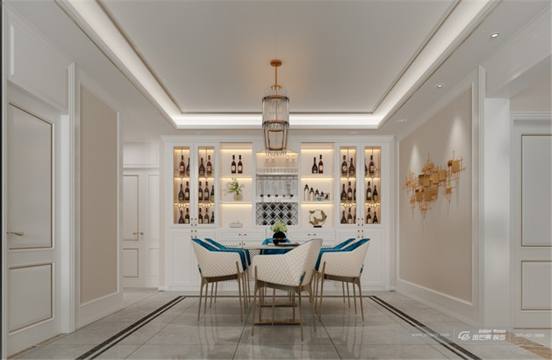 藍(lán)色的餐桌椅和客廳相呼應(yīng),歐式餐邊柜盛放紅酒提升家居品質(zhì)。精致不隨意的用餐空間。