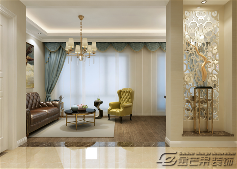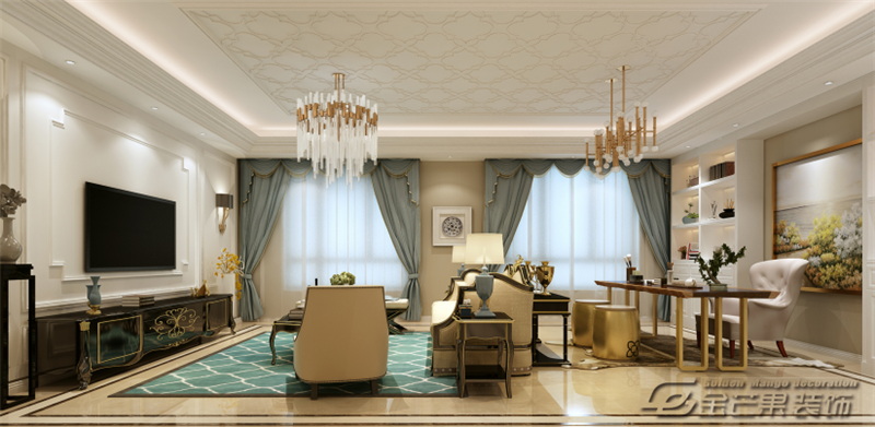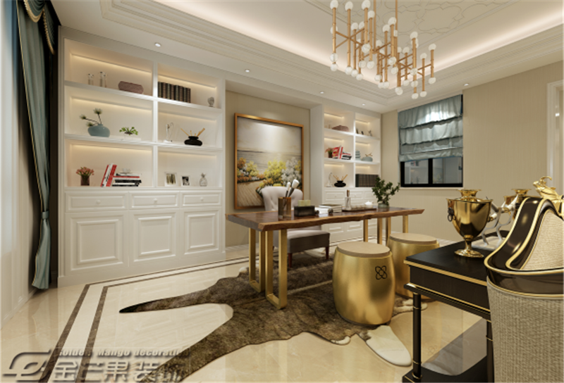 整體空間是以白色為主色調(diào),搭配棕色、米色、金色等輔助顏色,通過(guò)色彩的對(duì)比給人打造出一種華麗的感覺(jué)。充滿歐式特色的窗簾、沙發(fā)、桌椅、裝飾畫(huà)打造歐式風(fēng)格。金色家具的應(yīng)用給人奢華之感但又不顯夸張,恰到好處。客廳和書(shū)房的搭配增加房間的功能性。