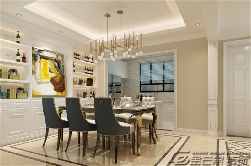 餐廳的桌椅選用上繼續(xù)沿用歐式風(fēng)格,藍(lán)色的座椅和整體空間的其他顏色點(diǎn)綴相呼應(yīng),紅酒柜上的紅酒、墻上的掛畫(huà),營(yíng)造歐式氛圍。
