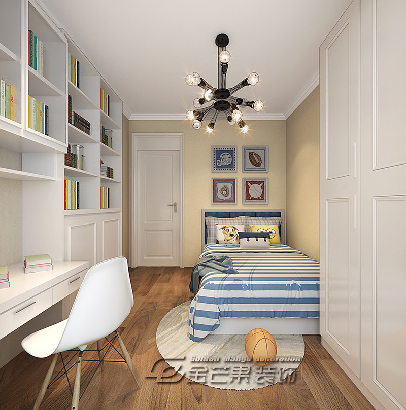 歐式的床具營造優雅、浪漫的歐式情調,簡潔的裝飾和木地板增加溫馨感。裝飾畫增加文藝感,藍色的地毯豐富空間顏色。