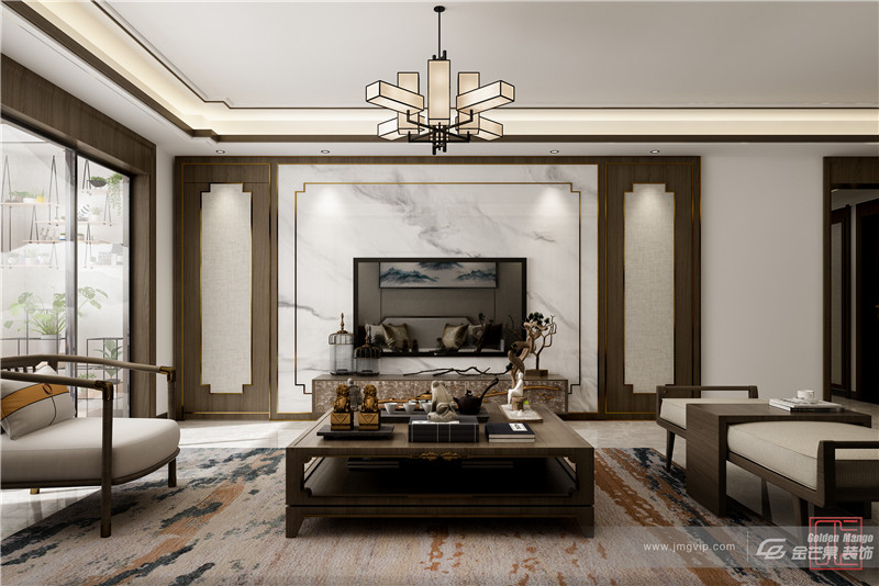 對稱沙發背景墻設計,展現對稱中式之美。簡單的直線條設計,既體現中式的質樸,又符合現代人追求簡單、舒適的居住需求。