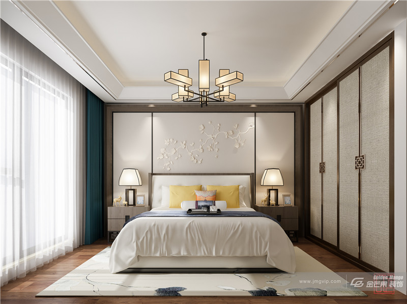 材質獨特的衣柜門,刻畫在細節處的中式元素,不管是對稱的設計,還是經典元素的運用與展現,都意在營造著一個主題——端雅貴氣。