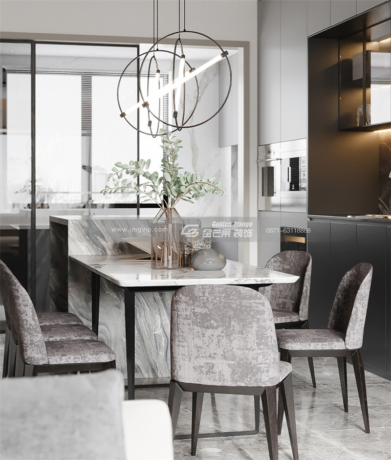 灰色的簡約和純粹的綠色搭配,營造出一種清新、清冽的氛圍。個性的燈飾為整個空間增色不少,讓餐廳變得更加精致了,也更有藝術感了。