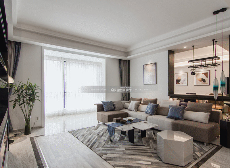 白色墻體、落地窗和溫柔的白色紗簾,只寥寥幾筆,卻最能體現簡約的魅力。沙發、小幾、地板,顏色搭配可見用心,既和諧高級,又營造溫馨、安逸的家居氛圍。地毯的搭配,讓空間更顯靈動。