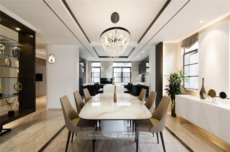 簡約的大理石餐桌椅,和整體空間融入得恰到好處,華麗的吊燈讓用餐變得有儀式感,簡約的氣質,輕奢的品質。