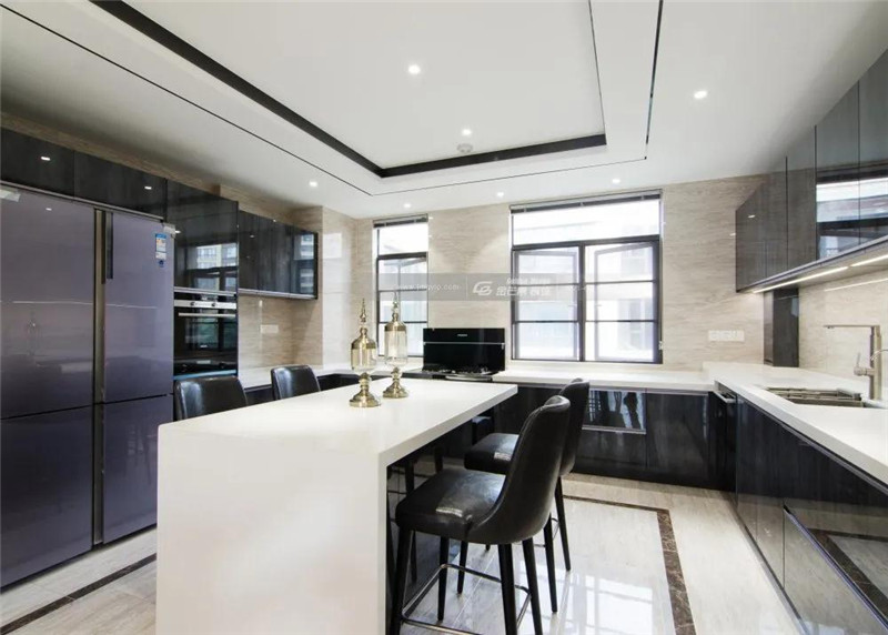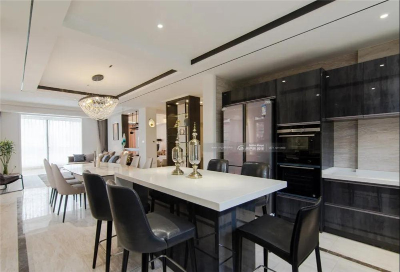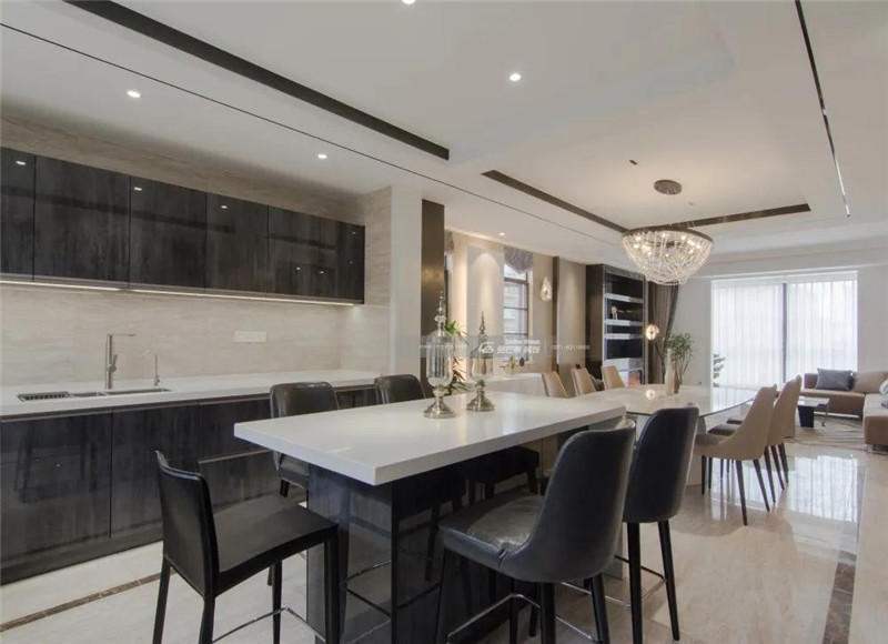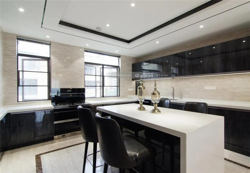 開闊的廚房,同時滿足中西廚配置,為烹飪美食帶來更多的便利。黑色的柜體和吊頂黑色線條呼應,打造的是一個富有高級感的空間。在如此優雅的環境下,仿佛食物也更加精致起來了。