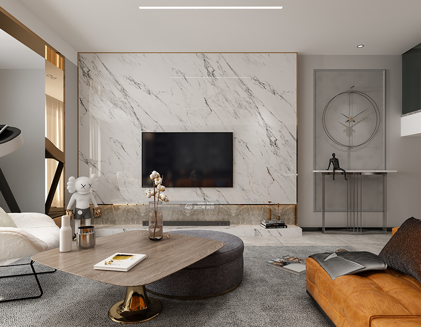 大理石電視背景墻,高級有格調,且和沙發背景墻的材質形成對比,形成豐富的空間層次感。
