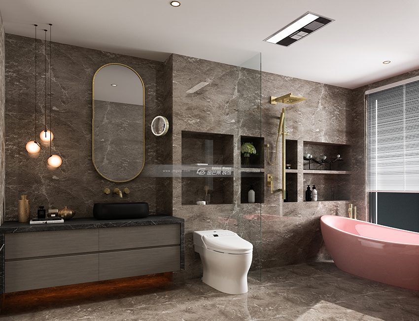 粉色的浴缸情調滿滿,俏皮可愛的燈飾和浴缸遇上大氣的灰色瓷磚,顯現出奇妙的個性、優雅感。