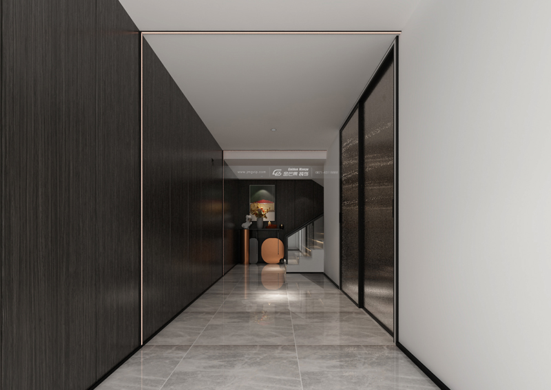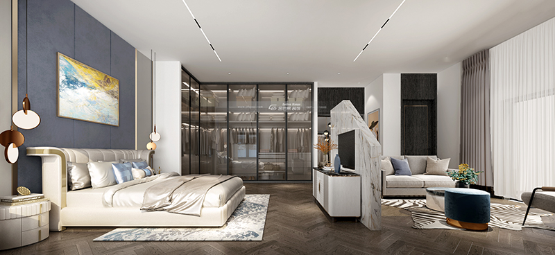 通過灰色木質墻板,藝術涂料,大理石材質使整個空間充滿現代極簡藝術的氣質,細節上質感十足。燈光上運用大量的線性光,點光源,即營造出空間的氛圍感,同時也增加了畫面構成的設計感。