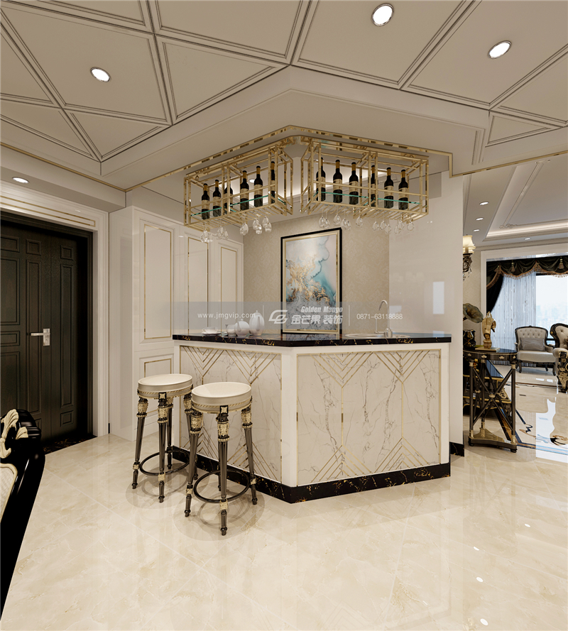 簡約的小吧臺,金屬材質的酒架,增加了優雅浪漫的情調,讓家更有儀式感了。