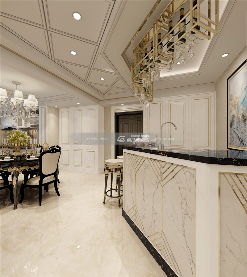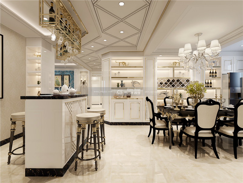 鑲金度邊的餐桌椅和餐邊柜,用精致的細節點綴,營造儀式感滿滿的歐式風情,精美的餐具,搖曳的紅酒,華麗的燈飾,為屋主營造一個浪漫的秘密花園。
