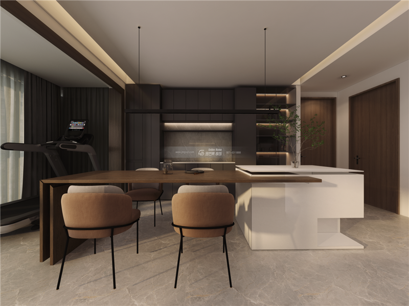 陽臺采用封窗處理并留出男業(yè)主健身活動區(qū)域,設(shè)置餐桌椅,既可以用餐,也可以品茶,讓空間帶來更多互動。