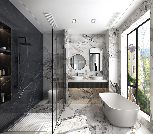 質感滿滿的墨藍色的棕色系,讓空間變得沉穩而有格調,搭配金屬線條和黑色細線條,精致感不言而喻。大理石上的花紋,充滿藝術氣息,時尚精致的的空間格調,優雅充滿韻味。