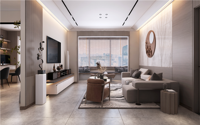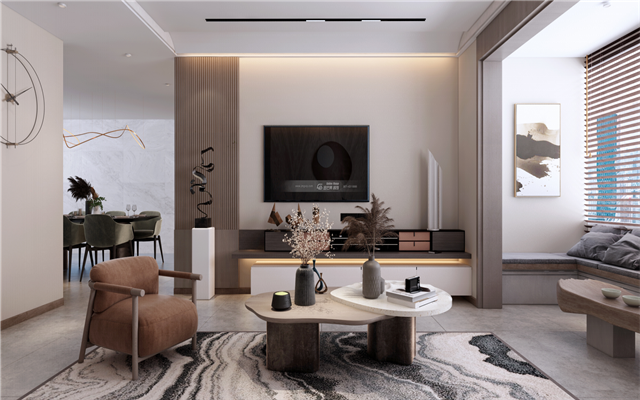 木飾面和地板的搭配,展現(xiàn)一種歲月的沉淀感,沙發(fā)背景墻裝飾畫,溫暖、活潑,增加藝術(shù)感。