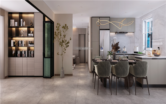 沉靜的氛圍中融入綠色的家居,像一縷清風(fēng),又像一杯香醇的茶,細(xì)膩優(yōu)雅,摩登氣質(zhì)。開放式的廚房讓家居空間更靈活。絨布餐椅帶來低調(diào)的華麗感。