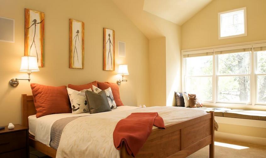 臥室光線以柔和、暖色調(diào)為主。可用壁燈、落地燈來代替室內(nèi)中央的頂燈,壁燈宜用表面亮度低的漫射材料燈罩,床頭上方的墻壁,裝一盞茶色刻花玻璃壁燈,具有古樸、典雅、深沉的韻味。床頭柜上可用子母臺燈,如果是雙人床,還可在床的兩側(cè)各安一盞配上調(diào)光開關(guān)的燈具,以便其中一人看書報時另一人不受光的干擾。